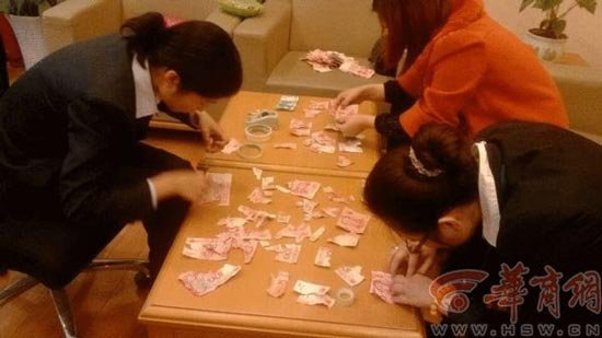昨日上午,银行工作人员将撕碎的现金铺在桌上准备拼接