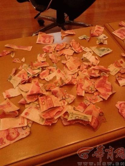 杨女士说,大概有3500元,基本全是100元的钞票,她试着拼凑,但没办法。“有的一张撕成三四片,有的被撕成了十几片,只有指甲盖大。”