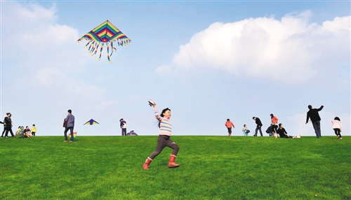 3月9日,中央公园阳光大草坪,市民们在蓝天下放风筝。当日是周末,阳光照耀山城,各地气温上扬,十分温暖,市民们纷纷外出踏青游玩。 记者 万难 摄