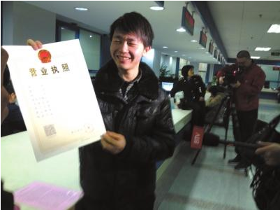 领到首张新版营业执照的“老板”叫王世栋,是清华大学的一名三年级研究生,学的专业与3D打印技术有关。去年年底,他与同学一商量,决定开个公司销售3D打印机设备。听说登记制度改革后可以一元钱办公司,他们昨天特意早早赶到海淀工商分局办理营业执照。