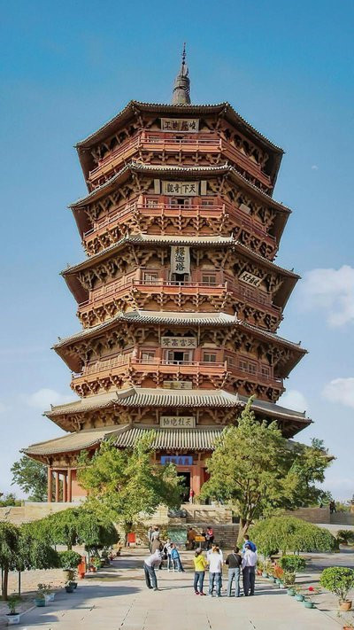 应县木塔全名为佛宫寺释迦塔,位于山西省朔州市应县县城内西北角的佛宫寺院内,是佛宫寺的主体建筑。建于辽清宁二年(公元1056年),金明昌六年(公元1195年)增修完毕。它是我国现存最古老最高大的纯木结构楼阁式建筑,是我国古建筑中的瑰宝,世界木结构建筑的典范。