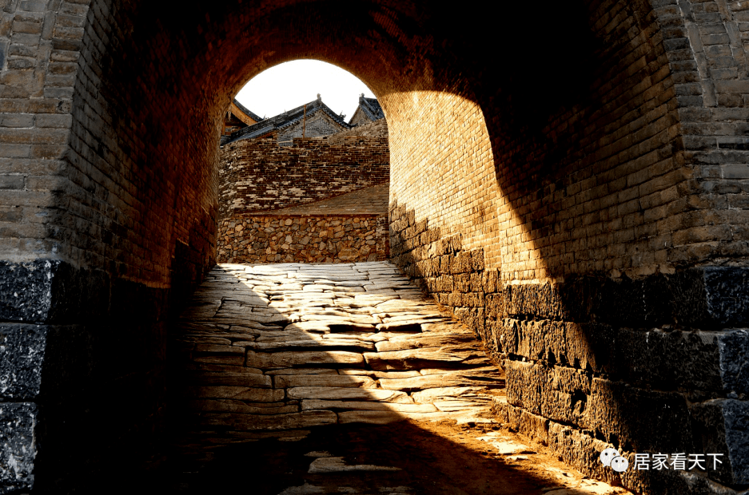 天险门是关楼南侧之门,东西向,是关南第一道城门,石座砖券,高12.5米,其主体建筑为明代所筑,残缺部分已于2010年恢复。天险门门洞上方额匾书刻“天险”二字,“天险”的天字据传也为武则天所创。上面是个草字头,中间是田地的“田”字,下面是大动干戈的“戈”字,表示马有草,田里有粮食,还有武器,就能拥有天下。右边是明正德八年《新修雁门关东西二楼记》石碑。门洞内的青石板为明代原物,这些清晰的车辙印向世人诉说着600多年来雁门关辉煌的过往,可以想象到当年雁门关上繁忙运输的景象。