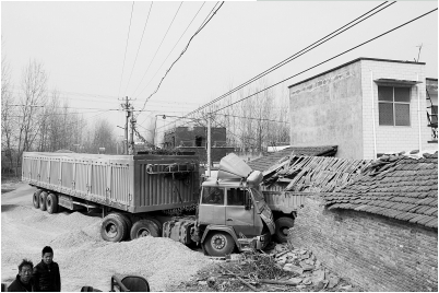 当日上午,记者闻讯赶到现场,看到两辆货车相撞后紧紧挤在一起,而路边的6间民房被撞倒塌。该民房是一家农资超市,屋内货物凌乱不堪,大量货物损坏。
