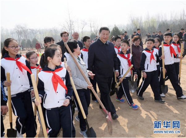 图为:2017年3月29日,习近平来到北京市朝阳区将台乡参加首都义务植树活动。这是植树活动结束时习近平同少先队员在一起。