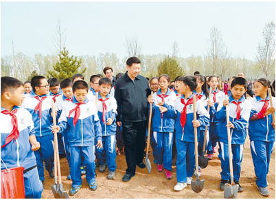图为:2016年4月5日,习近平来到北京市大兴区西红门镇参加首都义务植树活动。这是植树活动结束时习近平同少先队员在一起。