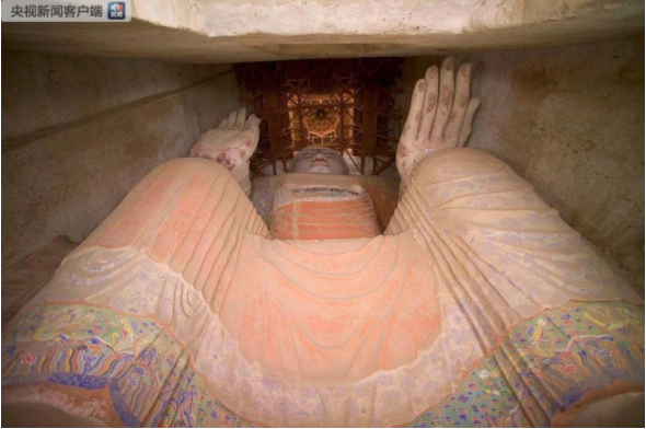 △这就是九层楼阁内的佛像,高35.5米,是莫高窟现存最大的一身倚坐佛像。工匠先在崖壁上凿刻出佛像的大体轮廓,然后用草泥垒塑,再用麻泥细塑,最后敷彩而成。(敦煌研究院提供)