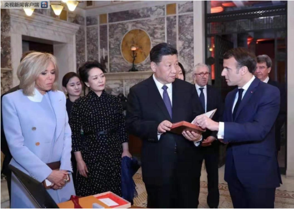 △今年3月习近平访问法国时,马克龙总统赠送了1688年法国出版的首部《论语导读》法文版原著。马克龙介绍说,《论语》的早期翻译和导读曾对孟德斯鸠和伏尔泰的哲学思想有过启发。这部《论语导读》原著目前仅存两本,另一本存放在法国国立吉美亚洲艺术博物馆。