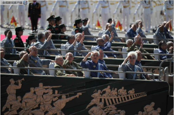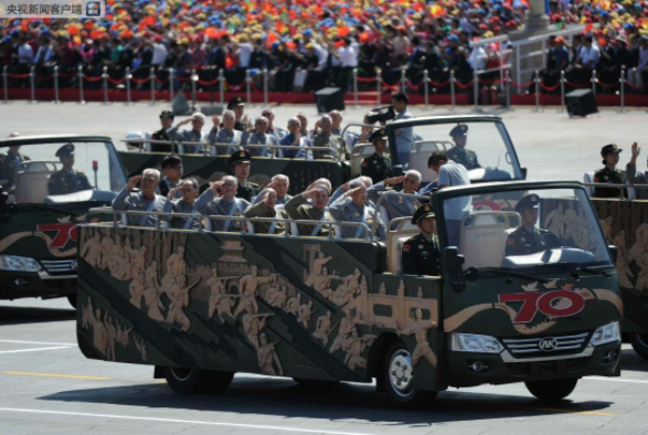 △2015年9月3日,中国人民抗日战争暨世界反法西斯战争胜利70周年纪念大会在北京举行。由300余名抗战老兵、英烈子女、抗战支前模范组成的2个乘车方队,行进在受阅方队最前面,接受祖国和人民的致敬。(资料图)